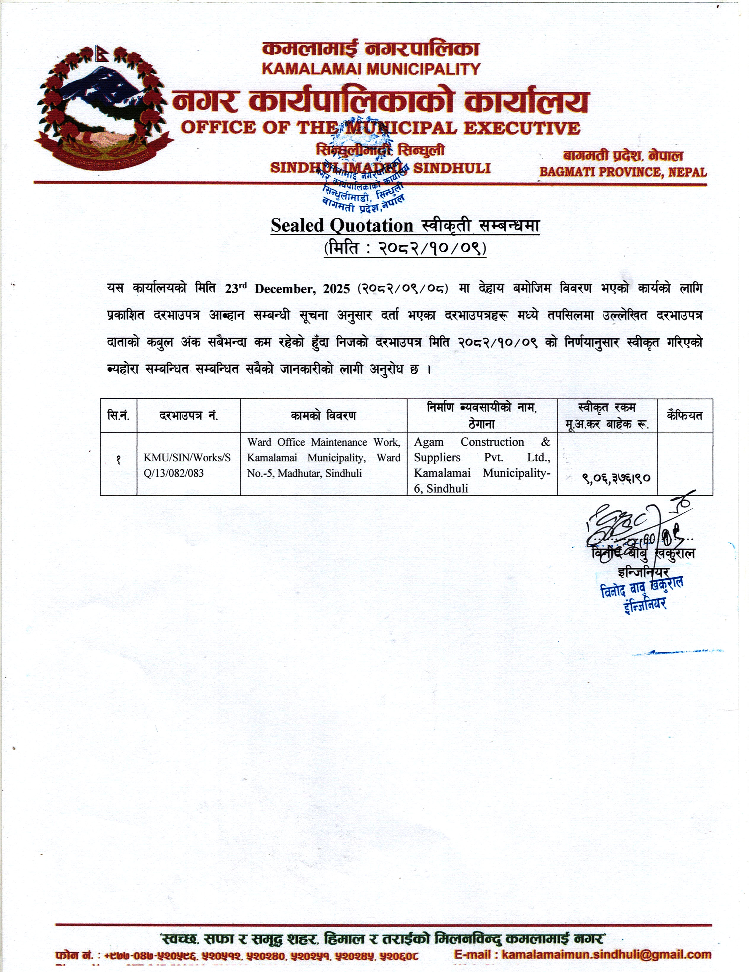 Sealed Quotation स्वीकृती सम्बन्धमा ।