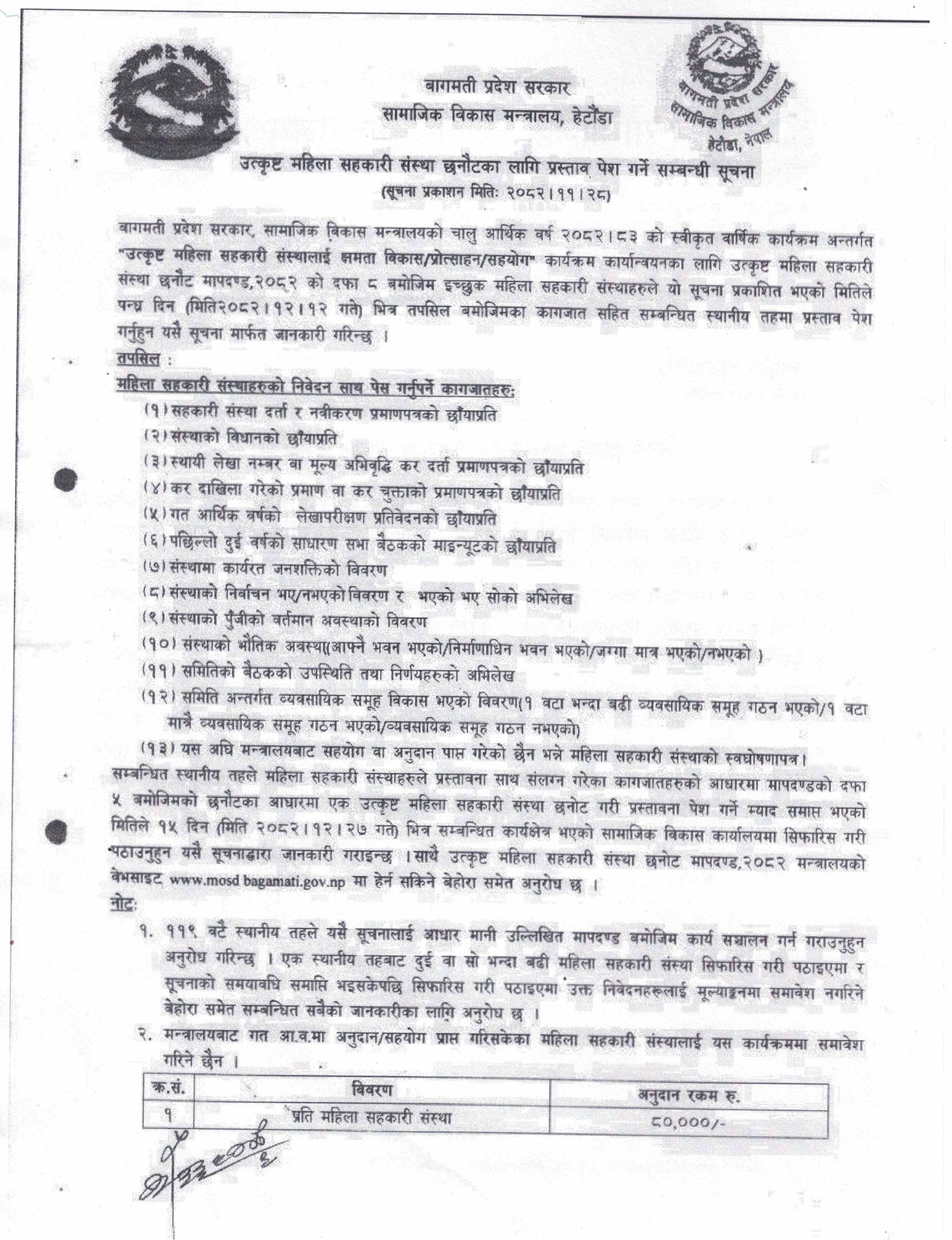 उत्कृष्ट महिला सहकारी संस्था छनौटका लागि प्रस्ताव पेश गर्ने सम्बन्धी सूचना ।