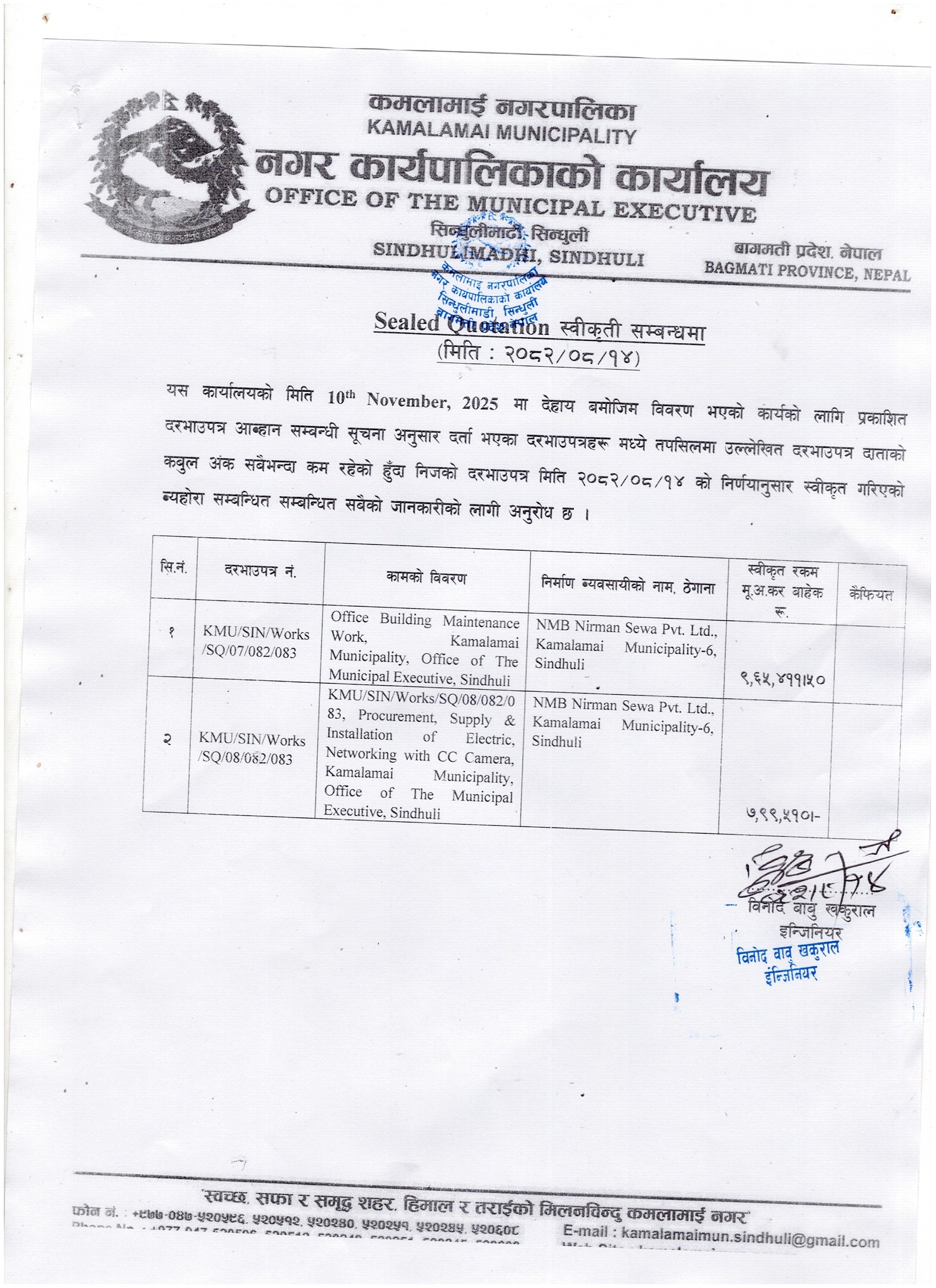 Sealed Quotation स्वीकृती सम्बन्धमा ।
